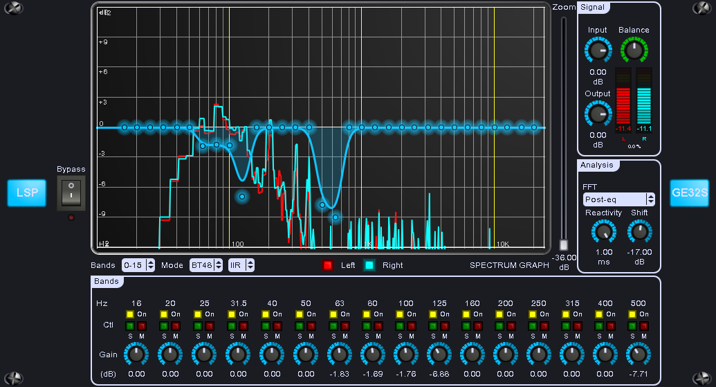 - 8 égaliseurs parametriques (16 et 32 bandes) (mono, stéréo, midside et LeftRight) ici la version stéréo 32 bandes :