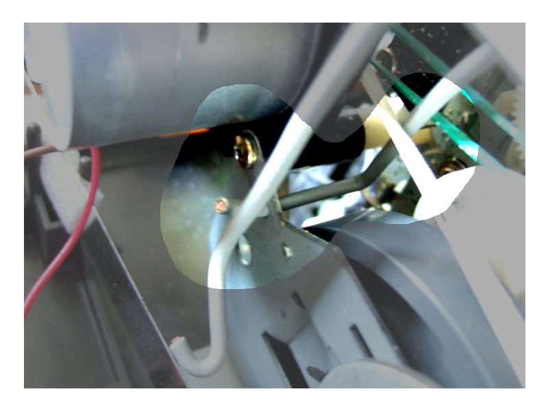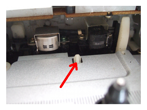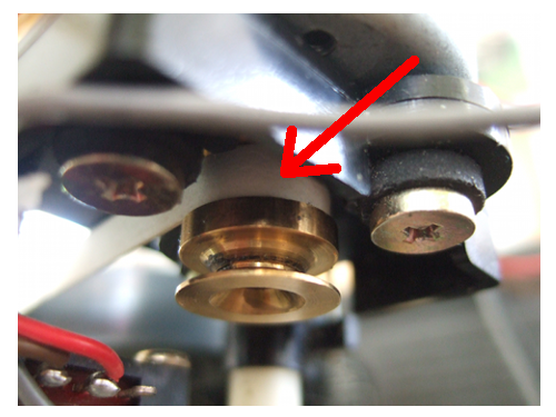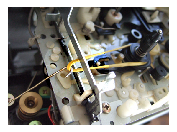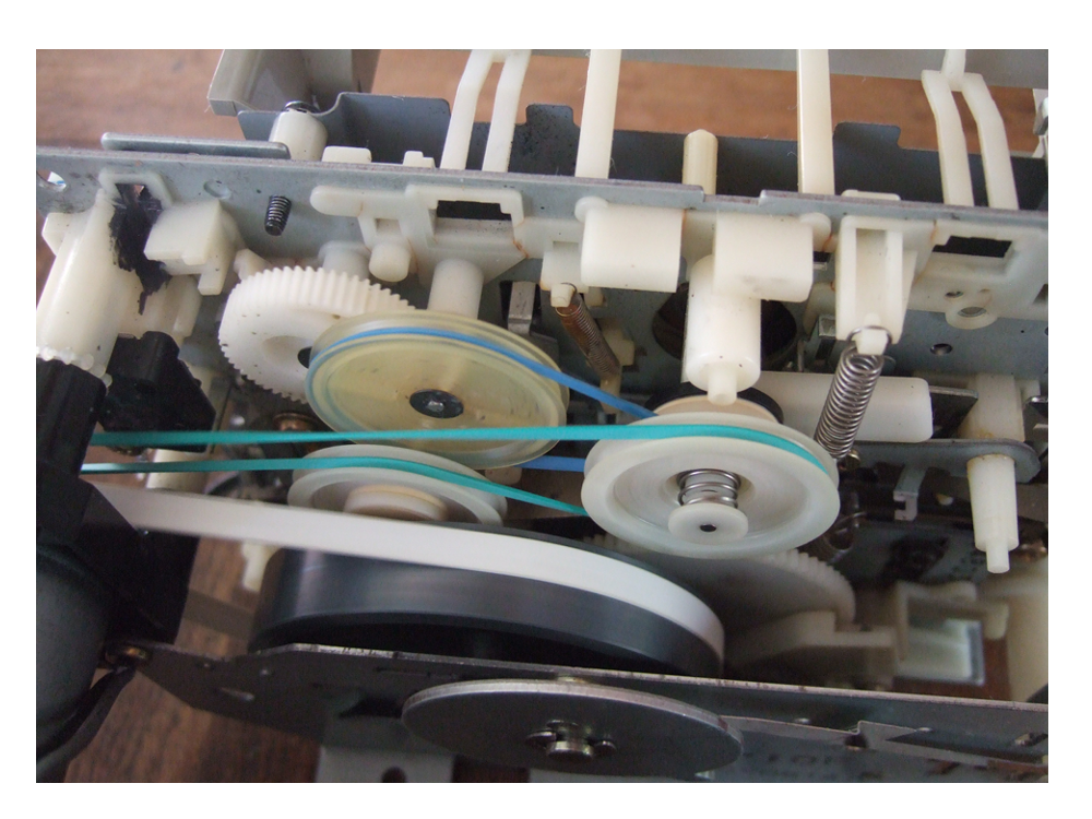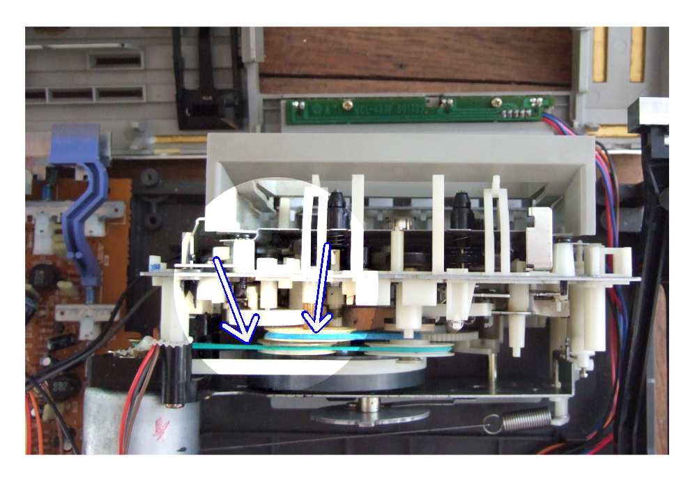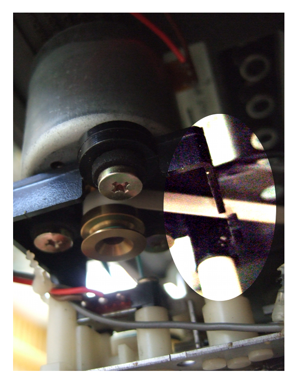 - L'endroit du collage de cette courroie présente un bourrelet : tentez, sans démonter, d'abraser ce bourrelet dû à la glu avec du papier émeri très fin (évitez que la poussière se dépose dans l'appareil).