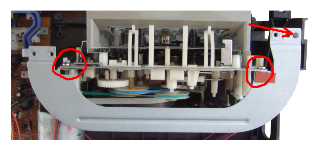 Dégagez la plaque des deux ergots près des tête de lecture/effacement.