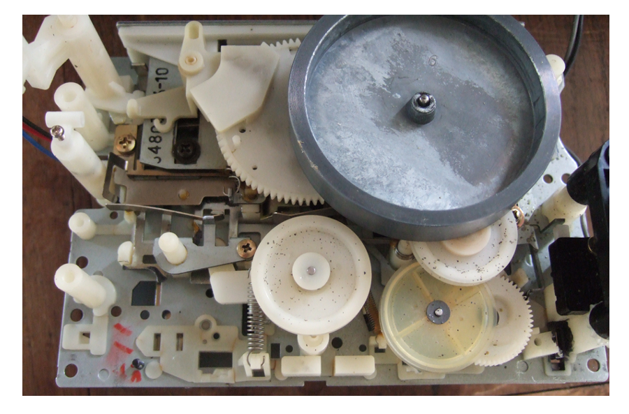 La plaque enlevée, on peut voir la poulie du téton d’entraînement. Il est possible qu'il y reste un résidu de courroie.