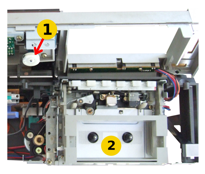 Replacez la tige métallique de manoeuvre du poussoir lecture/enregistrement en vérifiant que la pièce de contact du coté 1 est bien dans son logement et que cette tige est bien dans son guide en 2.