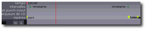 Dans un premier temps vous devez ajouter un intervalle via le bouton en bas de la fenêtre. Ceci provoquera l'apparition de marqueurs dans la fenêtre d'édition si la zone des intervalles est affichée. Les marqueurs seront affichés autour du témoin de lecture.
