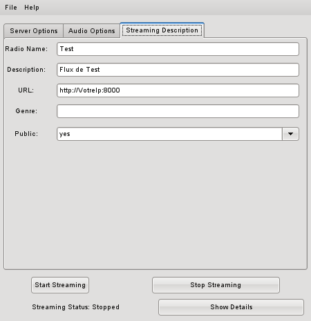 Ci-dessous la fenêtre de configuration de Icecast ou Shoutcast (à gauche) et la configuration du flux (à droite).