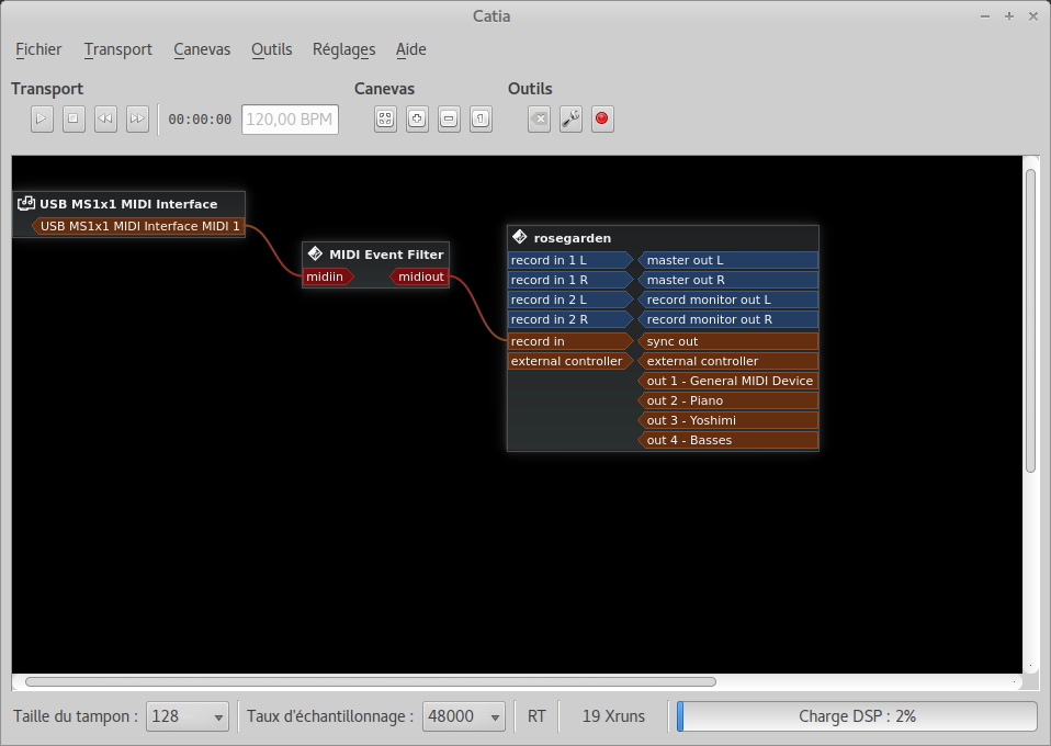 Enfin, dans Catia, je connecte "USB Midi Interface" (par où arrivent les données du clavier) sur "MIDI Event Filter" avant de le brancher en enregistrement sur rosegarden.
