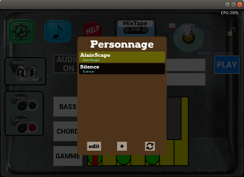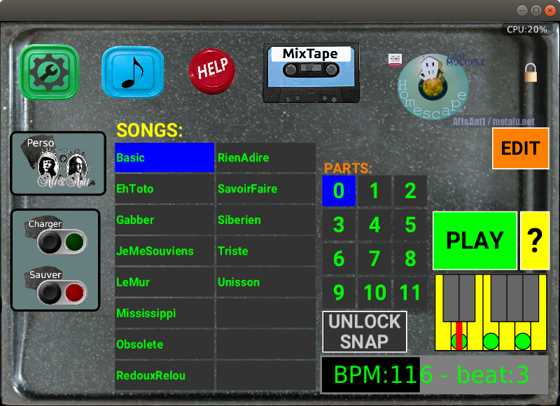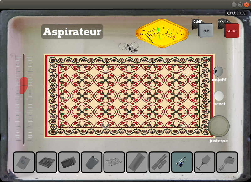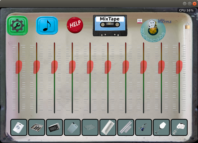 - À l'ouverture, on arrive sur la page de jeu, c'est une console de mixage (avec des faders en haricot) pour muter (couper), et démuter (ouvrir) les tranches (sons), il suffit d'appuyer sur les haricots d'une manière brève et sans bouger, quand on bouge et qu'on laisse appuyé en même temps, ça monte et ça baisse le fader de volume du son.