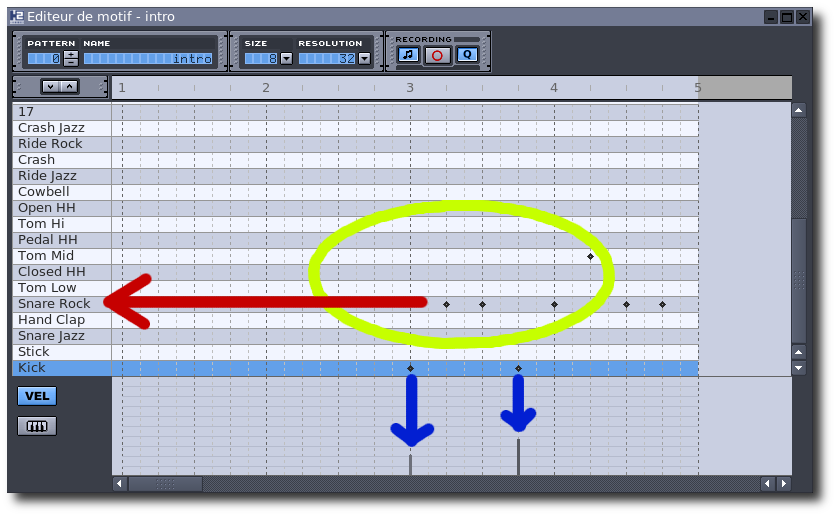 • choisir quel coup mettre : une grosse caisse ? une caisse claire ? une cymbale ? ... en cliquant sur la grille en correspondance avec l'instrument choisi (flèche rouge),