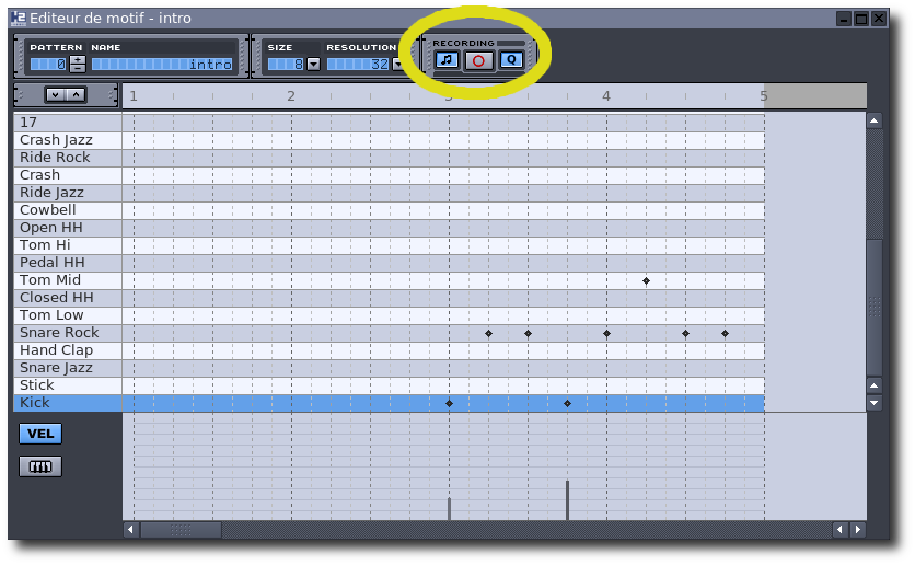 Tout ceci devra se faire en faisant attention à ce que le bouton intitulé VEL soit enclenché comme sur l'image ci-dessus (nous verrons à quoi sert le bouton piano plus bas).