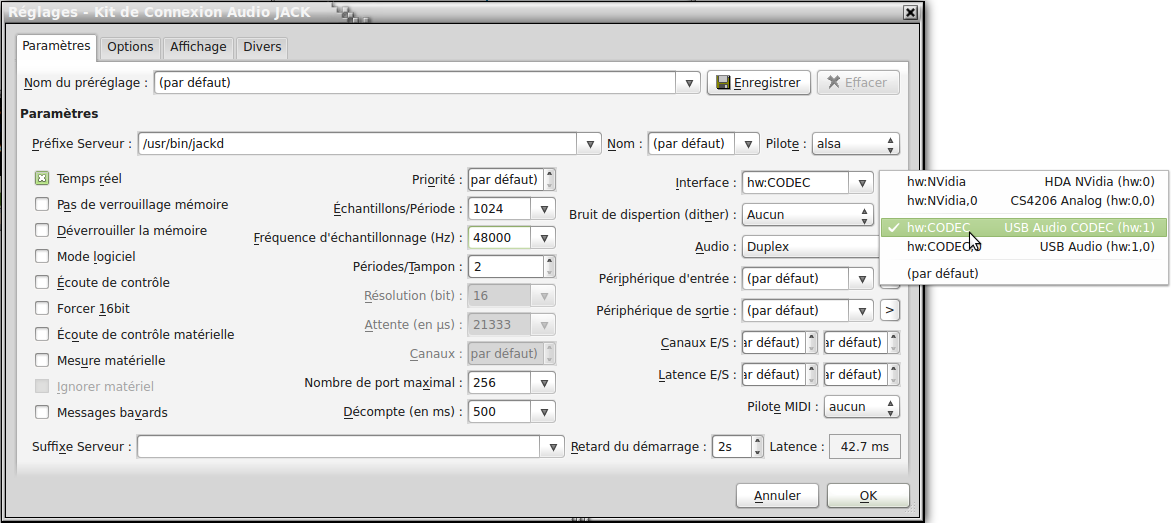 Par défaut JACK se connecte sur la première carte son (celle numérotée 0).Avec QjackCtl le choix se fait dans de la liste déroulante Interface de la fenêtre des Réglages :