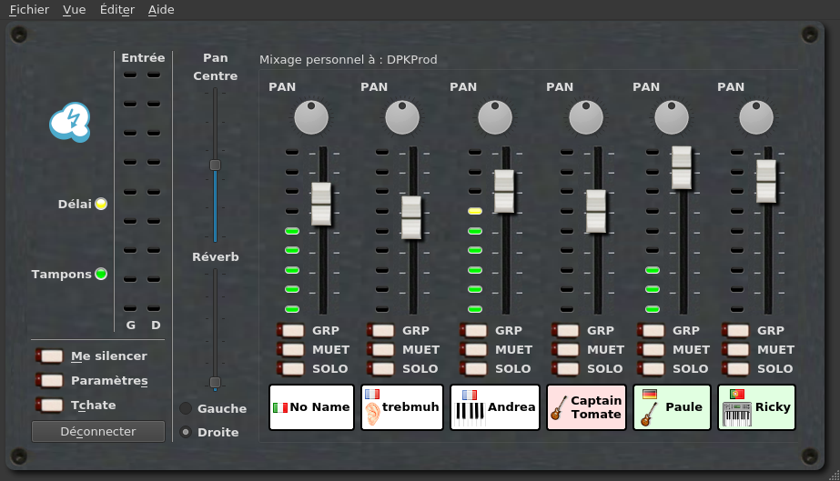 La fenêtre principale ressemble à une console audio dans laquelle on voit le niveau d'entrée du signal client dans la partie supérieure gauche. Le mixage personnel des niveaux de tous les intervenants est possible pour permettre un meilleur confort de jeu. Cela se passe dans la partie droite de la fenêtre.