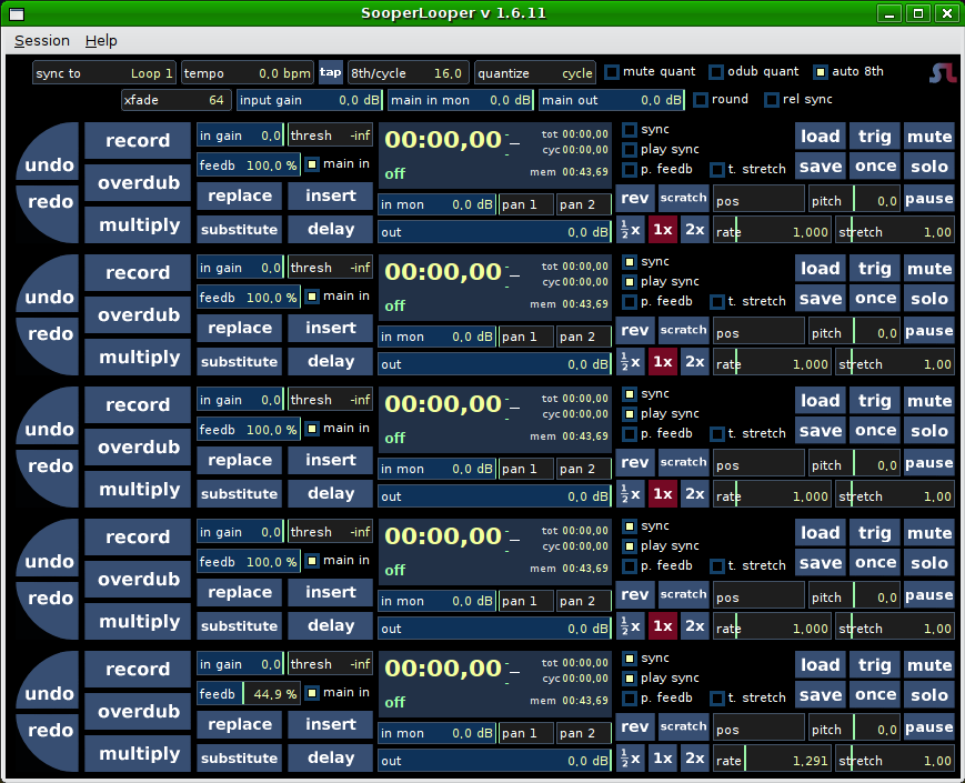 Si on veut mettre en boucle une suite d'accord pour, par exemple, jouer un solo dessus, il existe quelques pédales assez dispendieuses comme la Boss RC-20, ou les fameuses Boomerang. Néanmoins, sous GNU/Linux, avec l'aide d'un pédalier midi, il est possible de remplacer avantageusement ces pédales (quasiment aucune limite de temps d'enregistrement!), et à moindre coût!