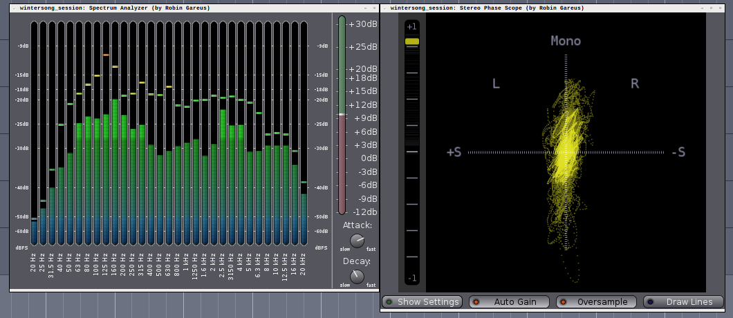 N'importe où dans Ardour, le Spectrum Analyzer et le Stereo Phase Scope s’avéreront plus intuitifs et réactifs visuellement que le greffon de Calf-Analyzer .