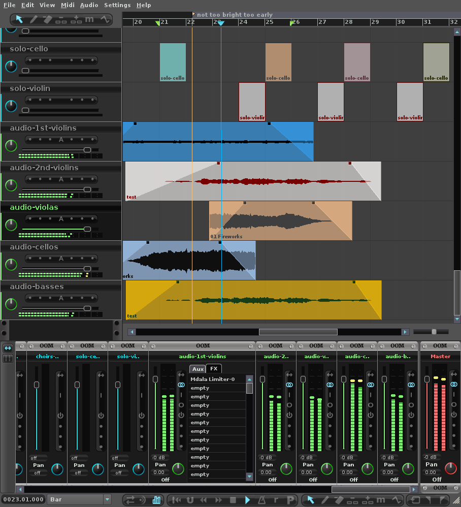 À première vue, la fenêtre du compositeur peut sembler un peu spartiate ... en apparence par rapport à d'autres DAW. Contrairement à ce que l'on peut penser ce n'est pas un DAW suivant les autres, OOM commence par défaut avec le minimum nécessaire, de cette manière les barres d'outils non essentielles ne sont pas chargées par défaut. Vous pouvez changer cela par un clic droit sur un espace vide de la fenêtre et sélectionner les barres d'outils de votre choix. Notre fosse d'orchestre(orchestra pit), avec le temps, contiendra beaucoup plus de fonctions, les navigateurs et les éléments de menu en onglets uniques, cela comprendra à l'avenir certains éléments de la barre d'outils que l'utilisateur n'utilisera probablement pas plus d'une fois ou peut-être deux dans une session, dans tous les cas. Pourquoi avons-nous fait cela? Pour donner à l'utilisateur le maximum d'espace possible dans la toile principale du compositeur afin de seulement charger les commandes et fonctions directement liées au travail de son projet.La toile principale est votre palette créative où vous ajoutez des pistes et effectuez les trois tâches principales d'un DAW, insérer, éditer et supprimer, pour l'ensemble de votre projet. Que vous visualisez toutes vos pistes, ou les pistes sélectionnées en utilisant la fonction de Trackview(vue de pistes) , la toile principale est susceptible d'être là où vous passez le plus de temps, c'est dans cet esprit que nous l'avons rendue aussi efficace à utiliser que possible.