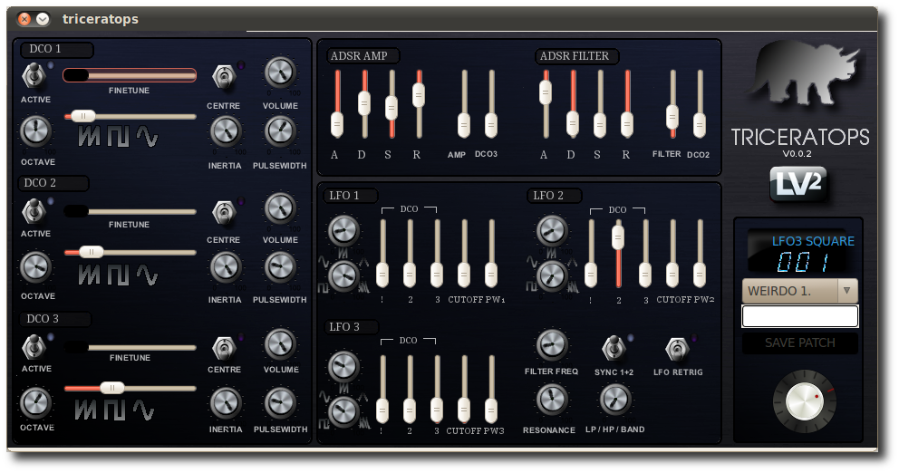 Triceratops est un synthétiseur polyphonique au format LV2. Il contient 3 DCO, 3 LFO et une gestion des enveloppes.