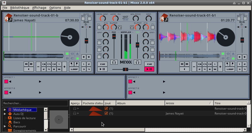 - Une bibliothèque de sons permet de visualiser les morceaux à disposition: au premier lancement de mixxx, il faut sélectionner le dossier qui fera office de racine de la bibliothèque. Il faut ensuite charger un morceau sur chacune des deux pistes à disposition par un clic droit sur le morceau voulu.
