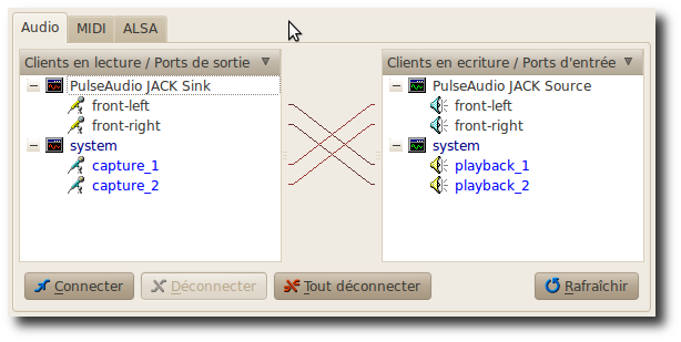 load-module module-jackdbus-detect channels=2 connect=0. Une baie de brassage sera alors utile pour faire les connexions souhaitées sans avoir à les refaire à chaque fois que vous aurez besoin de liaisons pulseaudio <-> jack.