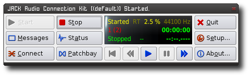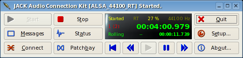 - Les boutons Stop, Retour rapide, Lecture, Pause et Avance rapide permettent de lancer simultanément ces commandes sur tous les logiciels connectés à Jack) (Ardour, Hydrogen, Muse, Qtractor, Rosegarden, etc.). Jack intègre en effet un protocole de synchronisation, qui se nomme Jack-Transport et qui permet de commander la lecture de tous les logiciels connectés. On peut donc positionner la tête de lecture d'Ardour depuis le "transport" de MusE ou l'inverse. Dans Ardour, ne pas oublier dans les options de choisir "jacksync" comme source de synchro. Quelques logiciels compatibles : Ardour, Hydrogen, MusE, Rosegarden... voir la page Portail des Logiciels.