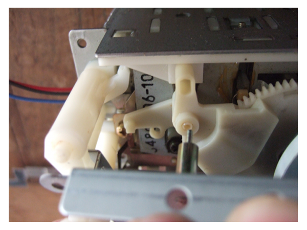 deux leviers en plastique qui sont retenus par un ergot du carter et qui ne seront plus fixés, et le cylindre qui est amortie par une rondelle cintrée servant de ressort.