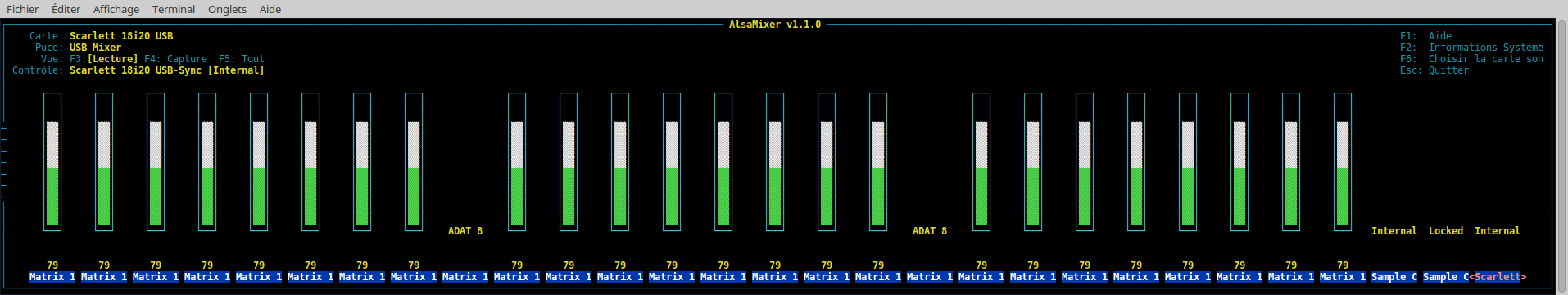 Ne pas oublier de vérifier à l'aide de la touche F6, que la carte-son en lice est bien celle que l'on veut utiliser. Ceci est vérifiable dans la fenêtre d'alsamixer en haut à gauche. Le nom de la carte y apparaît (par exemple "Scarlett 18i20 USB"). Dans le cas contraire prendre ses précautions pour que ce soit le cas. Mais ce point fait l'objet d'autres tutos. Ce n'est pas le propos ici.