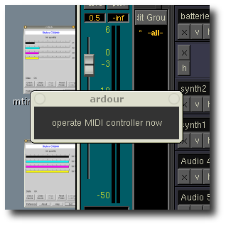 Tous les paramètres d'un plugin LADSPA peuvent être assignés à un contrôleur MIDI (potard, slider...) spécifique. il suffit de cliquer sur "crtl + bouton 3 ( click avec la mollette de la souris)" et de sélectionner un "contrôleur de volume" ou un paramètre d'un plugin LADSPA (ardour détecte alors le signal MIDI émis d'un des potars de mon clavier).