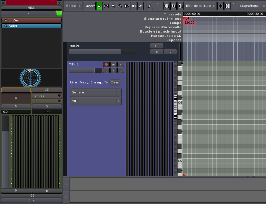 À ce stade vous vous serez très certainement rendu compte que l'insertion d'une piste MIDI dans ardour avec linuxsampler créer une piste un peu spéciale dans votre editeur . Je vous donne donc rdv sur le tutoriel dédié pour la suite : Ardour 3 LinuxSampler LV2