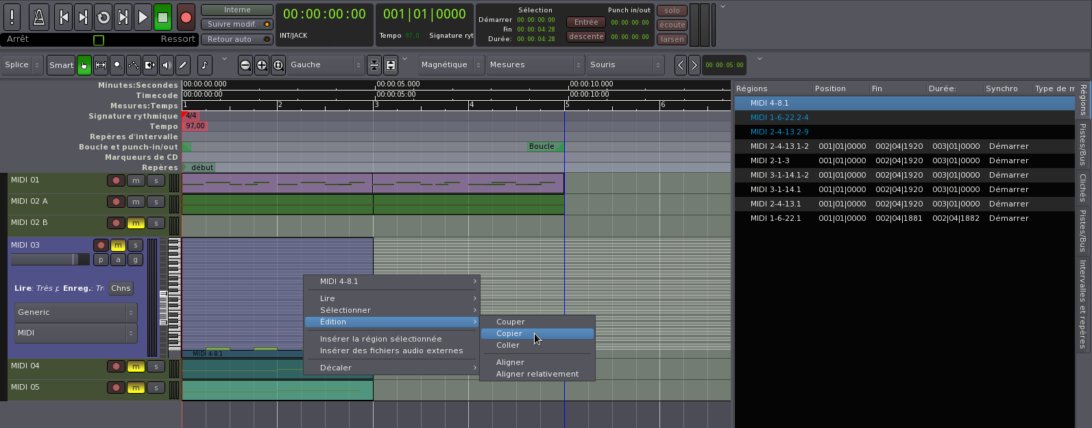 L'export ou l'import d'une région midi se passe un peu comme pour les fichiers audio sauf qu'il suffit de selectioner la region qui nous interresse : (dans l'orde de gauche à droite)