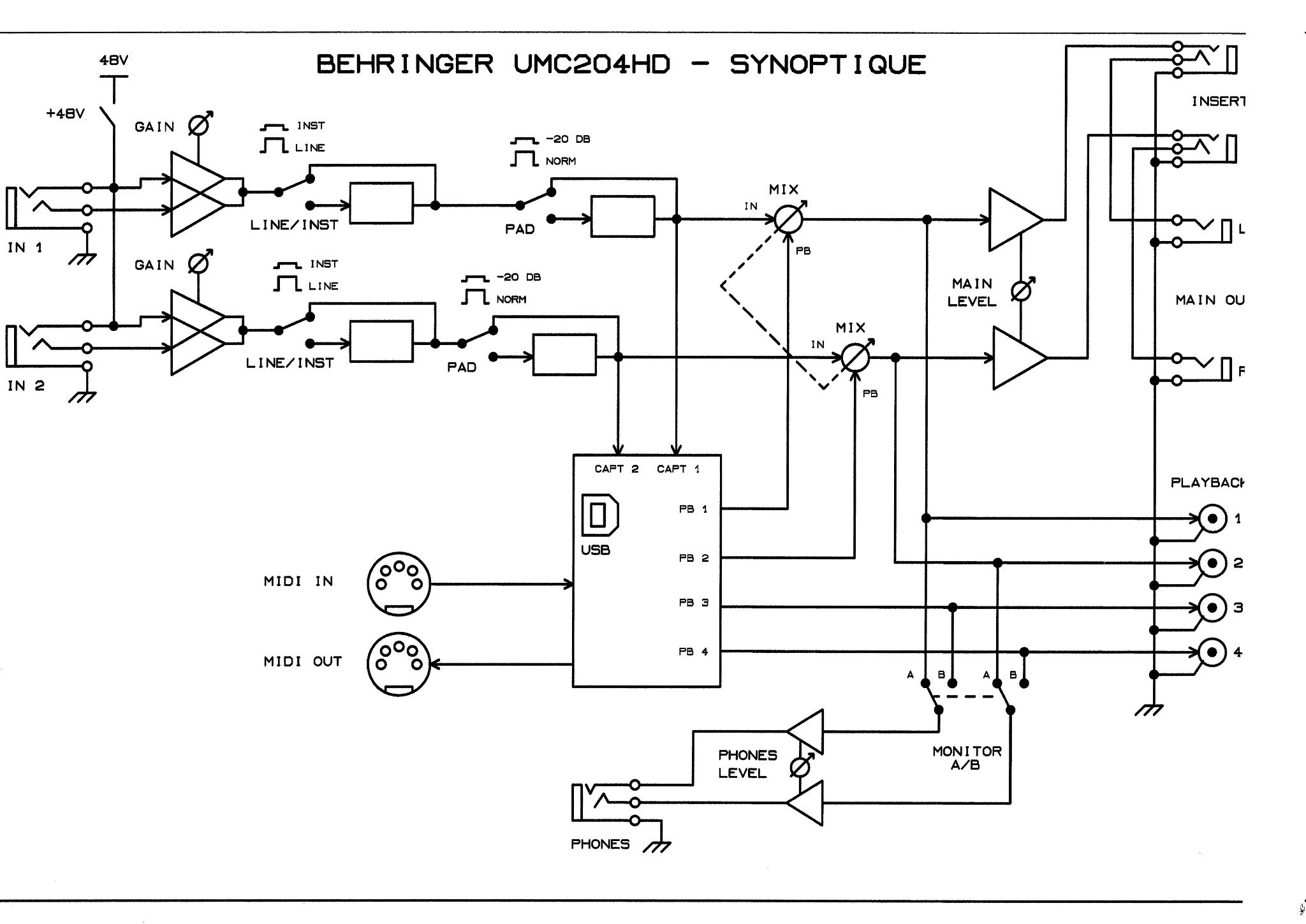 - 1 sélecteur de sources A/B (A = Playback 1 & 2, B = Playback 3 & 4)