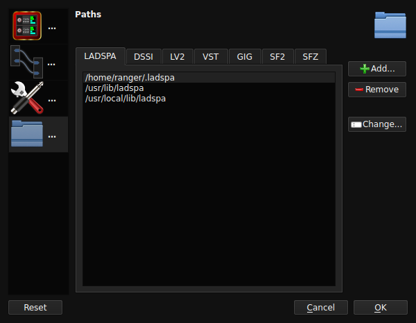 Carla est configuré pour détecter les greffons disponibles sur votre système à partir de leurs emplacements habituels ainsi que des emplacements que vous pouvez renseigner. L'option de menu permettant de renseigner ces chemins est accessible via le menu Settings > Configure Carla > Paths :