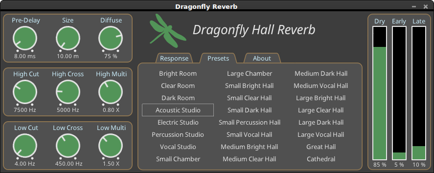 Dragonfly-reverb est une réverbération au format autonome, LV2, et VST natif.