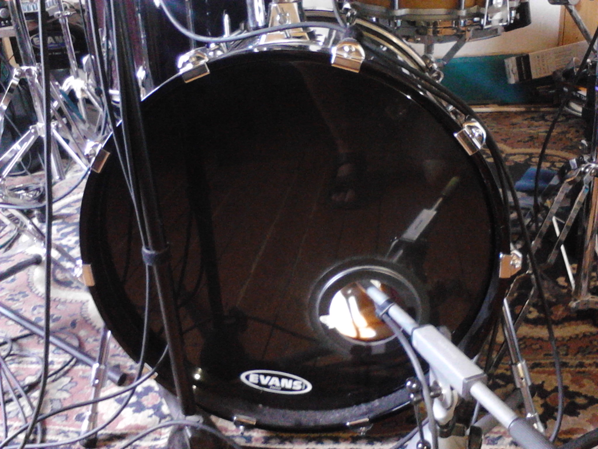 - Tom basse: Il faut éviter la zone du bord, donc l'en éloigner de 5cm (vers le milieu ou en hauteur). Sinon comme les autres tom, micro qui regarde le milieu du tom.