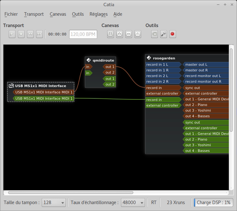 Attention : si votre système comporte des connexions alsa-midi et jack-midi, qui font parfois doublon. Certaines baies de brassage ne les affichent pas toutes à priori. Il faut bien sûr filtrer tout ce qui sort de "USB Midi Interface", ou supprimer les connexions inutiles.