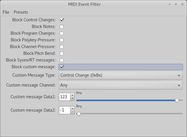 Une fois ce greffon ouvert, plusieurs réglages sont possibles. La première ligne propose "Block Control Change". Apparemment, c'est ce qu'il me faut, sauf que... bloquer tous les "Control Change" ne fera pas mieux que rosegarden, et je tiens à ne bloquer que le CC 123 ! Voyons un peu plus bas... "Block custom message"...