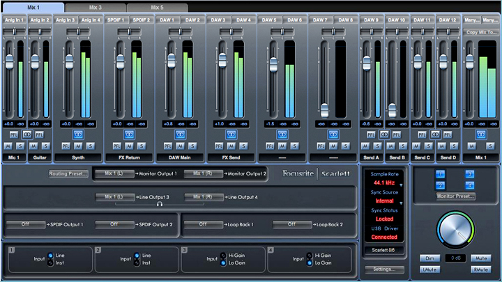 Cependant, un logiciel de mixage fournis par le constructeur (Scarlett MixControl) est indispensable pour modifier les réglages internes de la carte. Celui-ci permet entre autre de paramétrer le type des entrées en façades à savoir "line" ou "instrument", mais également de définir les entrées de la carte que l'on souhaite avoir sur les sorties.