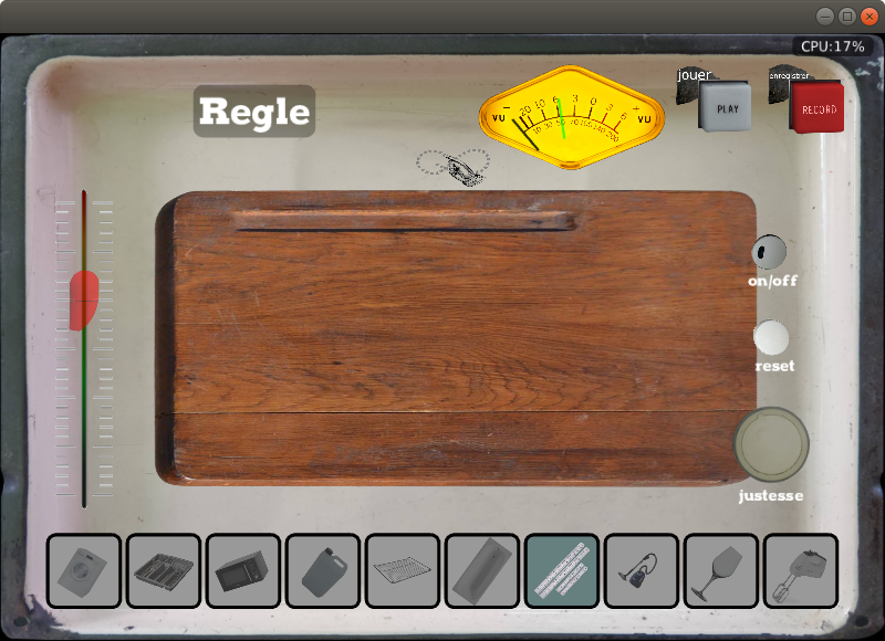 - À l'ouverture, on arrive sur la page de jeu, c'est une console de mixage (avec des faders en haricot) pour muter (couper), et démuter (ouvrir) les tranches (sons), il suffit d'appuyer sur les haricots d'une manière brève et sans bouger, quand on bouge et qu'on laisse appuyé en même temps, ça monte et ça baisse le fader de volume du son.