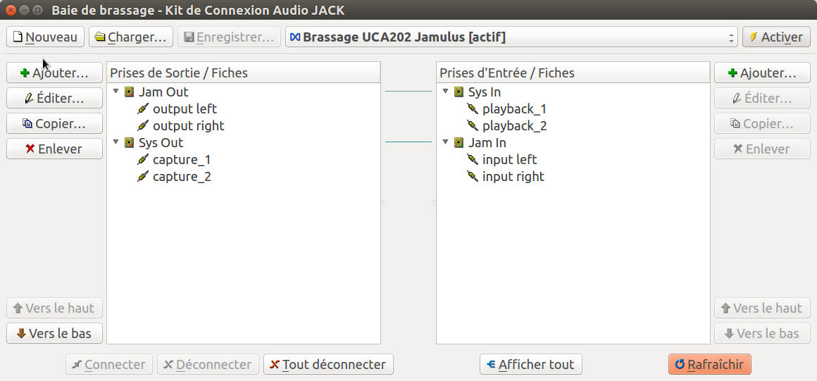 Démarre jack à partir de QjackCtl. Si tout va bien jamulus se lance et tu peux aller faire tes branchements dans la baie de brassage :
