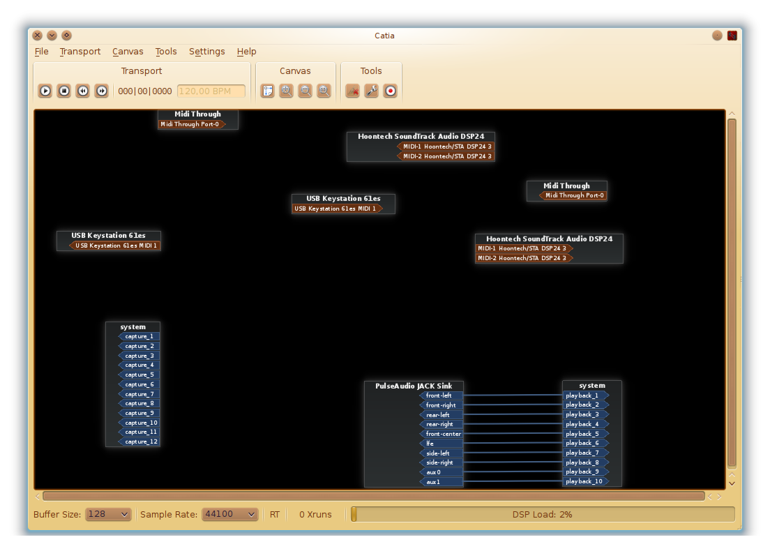 - Catia: équivalent de Patchage, Patchbay permettant de brancher ses programmes les uns avec les autres, un peu comme la fenêtre "connexions" de Qjackctl, mais de manière plus intuitive