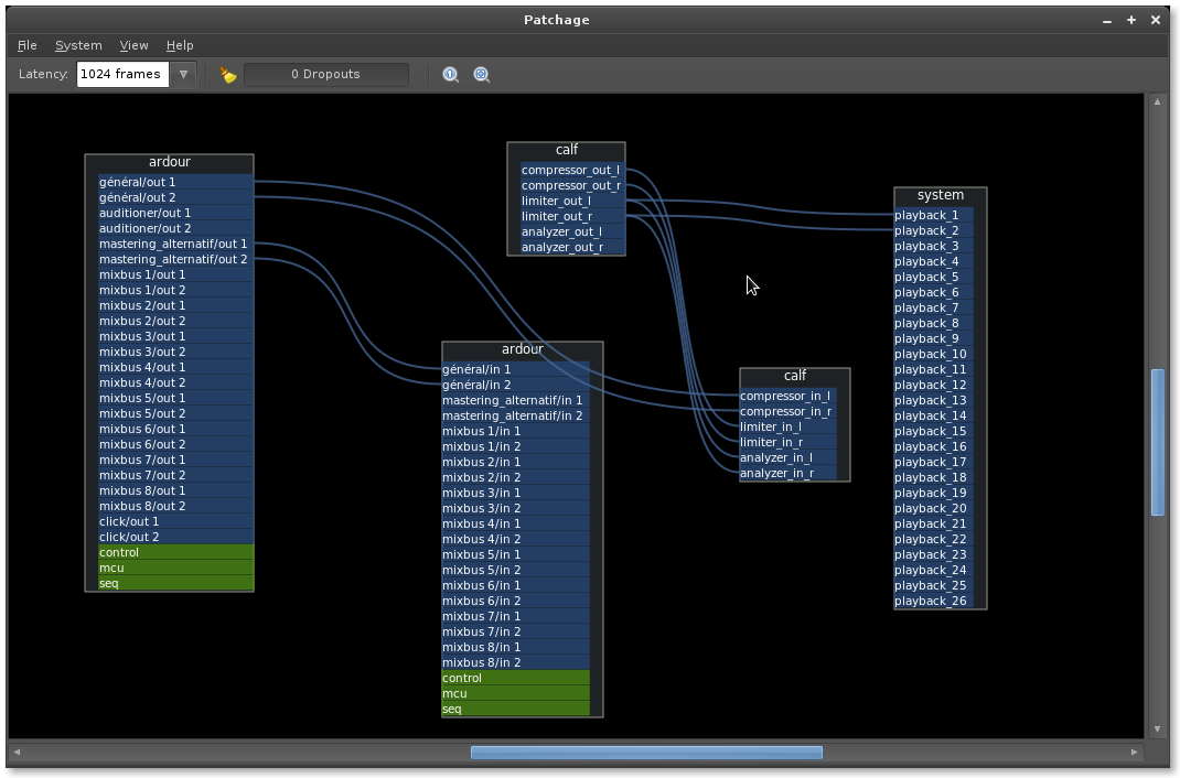 Et là bingo un jour je cherchais un greffon de visualisation (Fréquences et phase) pour Linux dans Ardour 3 et voilà que je tombe sur une édition récente des Calf Studio Gear en lv2 avec l’hôte permettant de les faire tourner en standalone CalfJackHost .