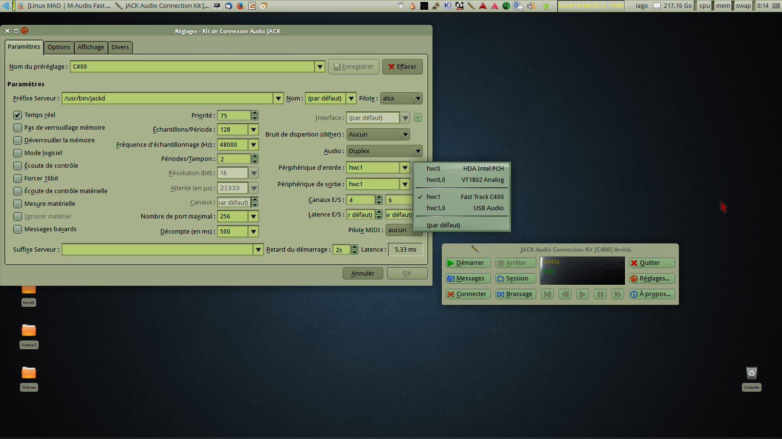 Dans Jack, il faut sélectionner le pilote C400 et non le usb-audio, si on souhaite disposer de tout le potentiel hardware et software (via alsamixer) de la carte.