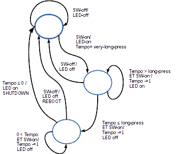Ce qu'on a ajouté pour l'essentiel, c'est le gestion du LED pour offrir un retour d'information à l'utilisateur. Cela est décrit par le graphe d'état ci-dessous :