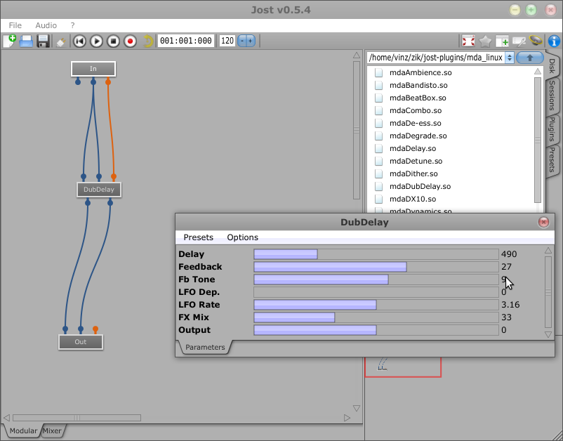 Et voici mda DubDelay dans JOST. Il est également modifiable en temps réel via MIDI :