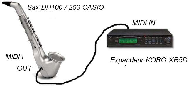C'est le même schéma que ci-dessus à la différence que l'expandeur n'ayant pas de clavier (c'est en quelque sorte une « boite à sons » 😊Remarquez l'utilité de la prise thru (à travers), permettant de relier en série plusieurs expandeurs (dans la limite de 3 / 4 à cause de la dégradation du signal). Il existe d'ailleurs des boitiers permettant de brancher plusieurs modules / synthétiseurs (sorte de multiprise MIDI 😊, 20 expandeurs ou + en rack piloté par le même clavier est donc possible !