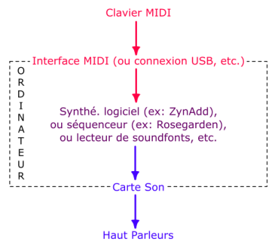 Dans le système linux, c'est ALSA ou JACK qui prend en charge le flux interne des données MIDI.