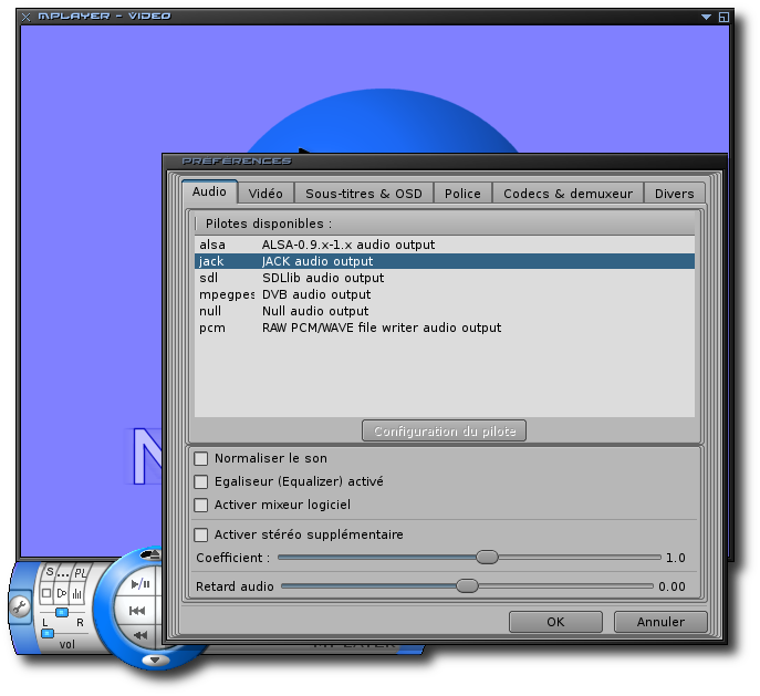 Vous pouvez également régler la sortie audio vers JACK en utilisant l'interface graphique gmplayer, via le menu "Préférences" -> Onglet "audio" :