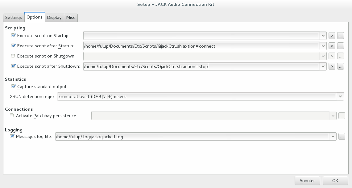 setup/options * script-after-startup avec $HOME/xxxx/QjackCtrl.sh action=connect * script-after-stop avec $HOME/xxxx/QjackCtrl.sh action=stop