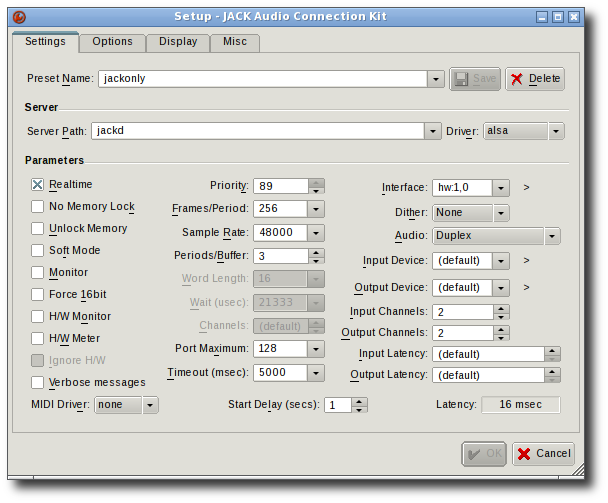 • Server Path : Doit être réglé sur Jackd (les valeurs jackstard et jackrealtime concernaient des patchs nécessaires dans le noyau 2.4, et en principe vous êtes en noyau 2.6)