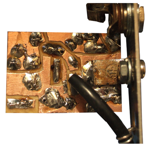 Pour réaliser ce circuit j'ai préféré utiliser la méthode du "fraisage" avec la mini-perceuse pour créer les séparations, plutôt que de graver le circuit à l'acide. Le circuit sera fixé sur la barrette avec une petite équerre soudée ( pour info, c'est une lamelle de cuivre coupée, pliée et percée ) et pour assurer la stabilité la connexion "chaude" de la prise micro 3.5 est aussi directement soudée sur le circuit ; Cette opération demande un peu de dextérité mais est très efficace.