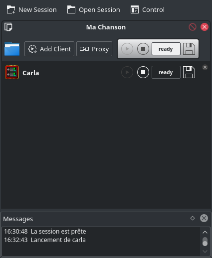 Vous remarquerez que le programme se lance, et qu'un nouvel élément de liste apparaît dans la fenêtre principale de Ray Session, avec de gauche à droite: l'icône de l'application, le nom de l'application (ici "Carla"), un bouton Lancer, un bouton Stop, le statut de l'application, un bouton de sauvegarde, et un bouton de suppression.
