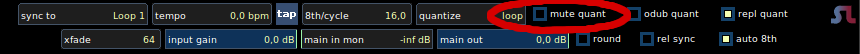 - mute permet de ne plus entendre la boucle. Elle continue de tourner. Si on ré-appuie dessus, elle repart là où elle en est (pas du début). De ce fait, une boucle synchronisée restera toujours synchronisée. mute peut être synchronisé en cochant la case mute quant.