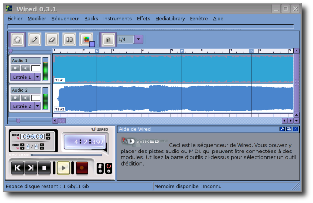 Wired est un séquenceur Audio et MIDI de la même catégorie que Rosegarden (sans l'éditeur de partition). Wired utilise son propre type de greffons (plugins), mais supporte aussi les modules LADSPA et DSSI.