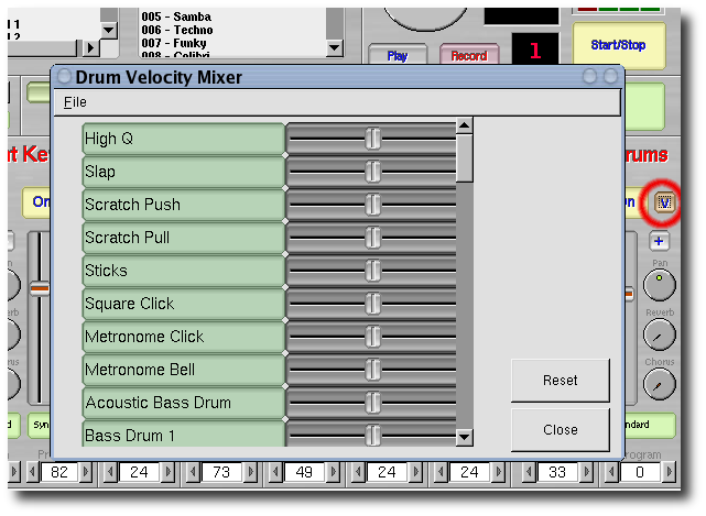 Toutes les tables d'échantillonnage de type Général MIDI produisent des sons différents et cela constitue un problème, parce que les séquences ressortent vraiment différemment avec deux tables d'échantillonnages différentes et peut-être vous aurez besoin ajustez les volumes ce qui n'est pas un travail facile. Le mélangeur de « vélocité» de percussion aide quelque peu à régler ce problème.