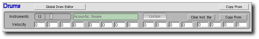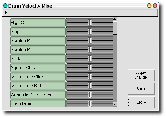 Toutes les tables d'échantillonnage de type Général MIDI produisent des sons différents et cela constitue un problème, parce que les séquences ressortent vraiment différemment avec deux tables d'échantillonnages différentes et peut-être vous aurez besoin ajustez les volumes ce qui n'est pas un travail facile. Le mélangeur de « vélocité» de percussion aide quelque peu à régler ce problème.